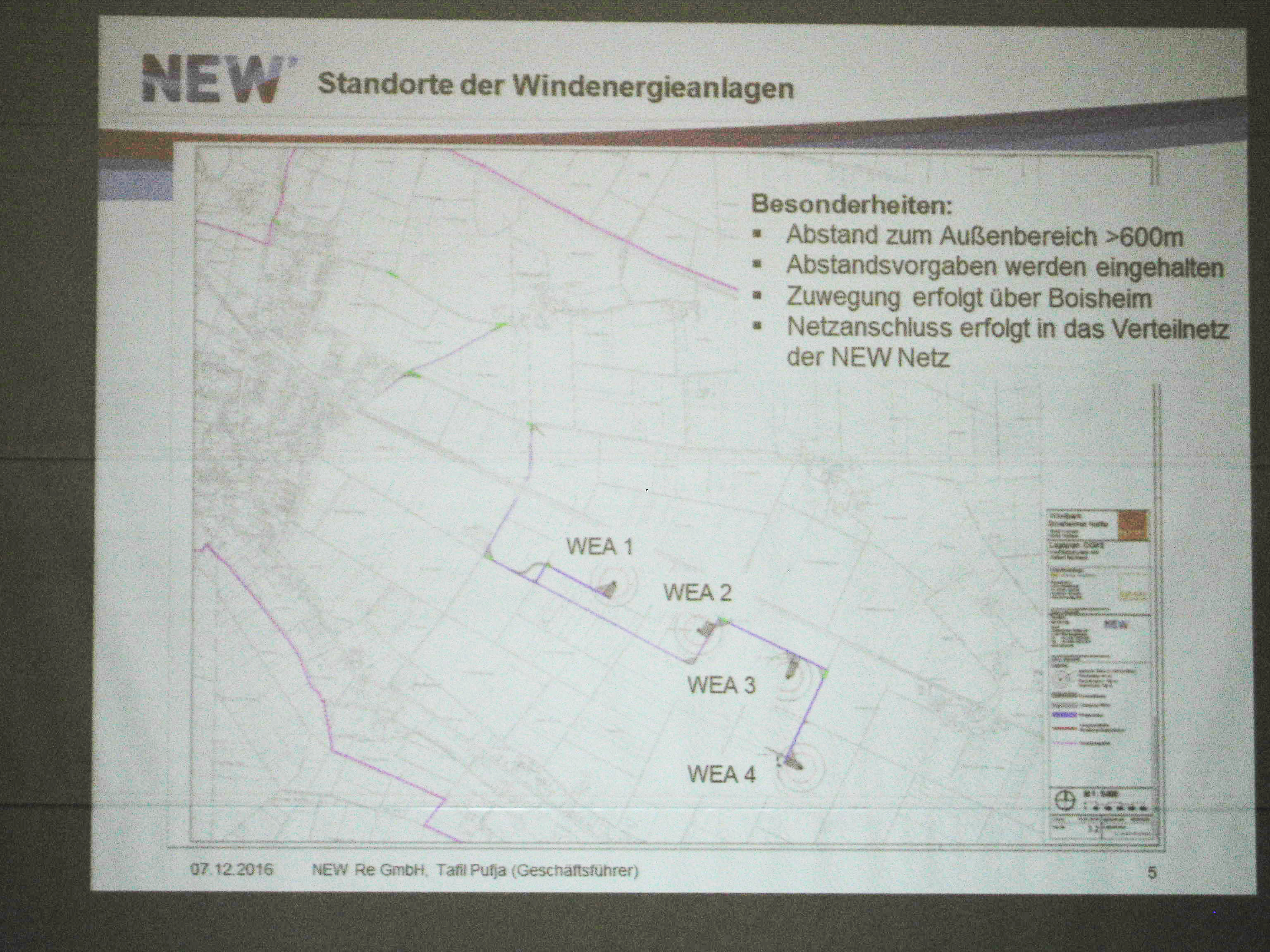 Auch der Vertreter des Antragstellers NEW war nicht gut vorbereitet. Er konnte keine klare Auskunft geben über Standorte von Referenzanlagen des geplanten Typs Senvion 3.2 M, sowie über die Anzahl bereits gebauter Anlagen und deren Betriebsstunden sowie den daraus sich ergebenden vorliegenden Erfahrungswerten. Bei einer Investitionssumme von 20 Mio EURO eine m. E. geradezu verantwortungslose Nachlässigkeit.