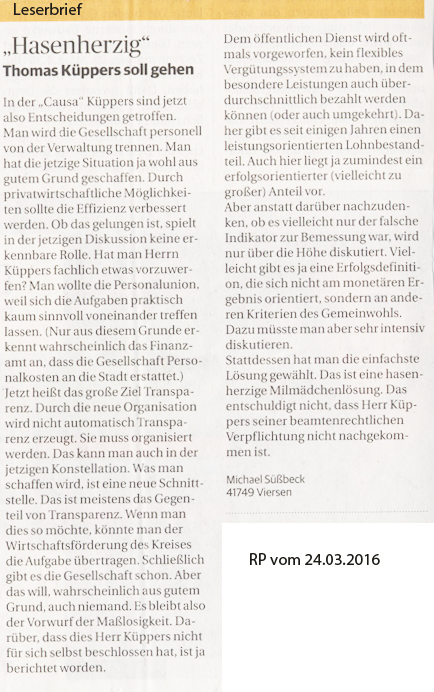Es mutet schon etwas seltsam an, dass Politiker, die die Entscheidung für die Gehaltsstruktur von Herrn Küppers zu verantworten haben, jetzt an der Lösung der Causa Küppers beteiligt werden. So wird denen die Möglichkeit eingeräumt, eigenes Fehlverhalten zu schönen.
